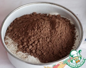 Отдельно смешать сухие ингредиенты, рисовую муку, черемуховую муку, разрыхлитель и отруби.