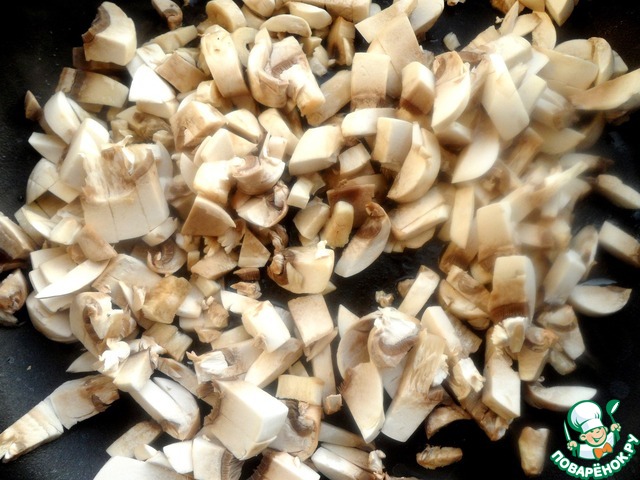 Обжарить мелко порезанные шампиньоны на растительном масле, посолить и поперчить по вкусу.