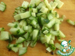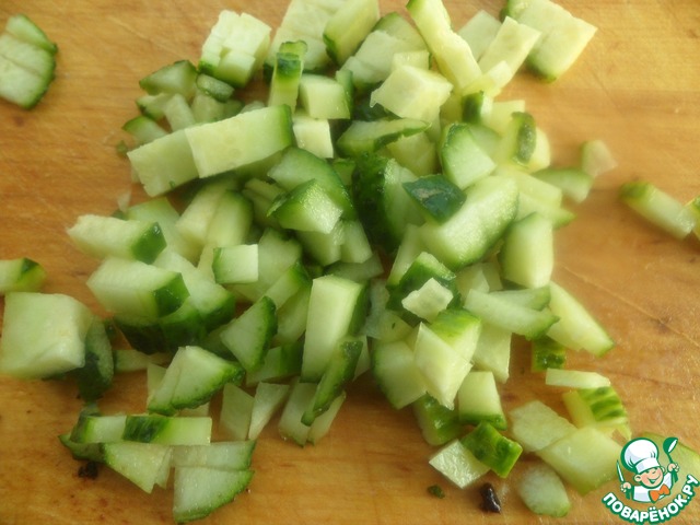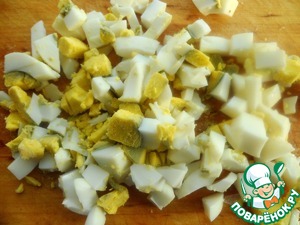 Отварить до готовности кальмары и мелко нарезать мелким кубиком.