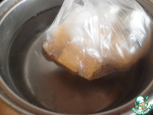 1 Пакеты не расплавились, а сыр, размягчаясь, превращается в тягучую маслянистую массу, которая легко отходит от пакета. Достаем пакет с расплавленным сыром из кипятка, обрезаем верх пакета и аккуратно, чтобы не обжечься выливаем расплавленный сыр на пищевую пленку.