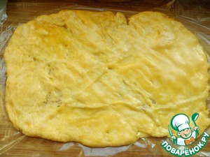 Расплавленный сыр аккуратно тонко раскатать между двумя пищевыми пленками.