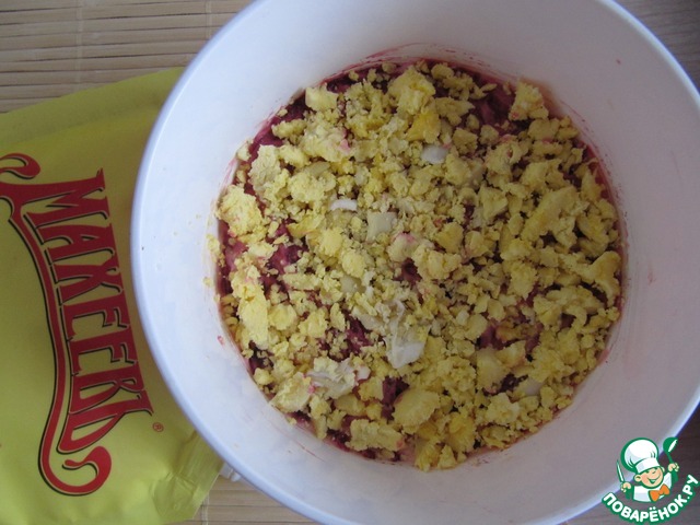 Затем выложить слой мелко рубленного яичного белка, смазать майонезом