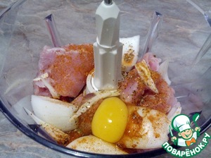 Приготовить фрикадельки: лук, мясо, немного соли, специи и яйцо сложить в комбайн и сделать фарш.