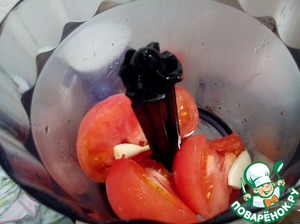 Помидоры ошпарить кипятком, снять кожицу и измельчить в блендере вместе с чесноком.