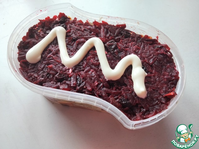 Третий слой-свекла с черносливом и орехами, полейте майонезом