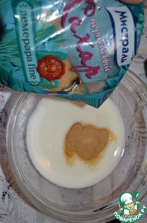 Пока выпекается корж, в йогурт добавляем ванилин и сахар Демерара fine от ТМ "Мистраль". Йогурт по густоте должен быть похож на сметану. У меня был немного жидковатый и он, не слишком закрепил потом кусочки коржа. Если у Вас йогурт очень густой, можете его разбавить молоком.