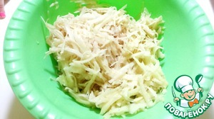 Чистим картофель, натираем его на крупной терке (я замачиваю минут на 15 в холодной воде, что крахмал немного "удалился")