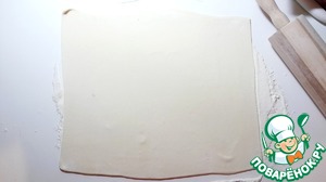Берем слоеное тесто (у меня бездрожжевое) и разрезаем его на 2 части. Одна часть у нас пойдет на основу пирога - вторая послужит крышечкой.