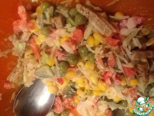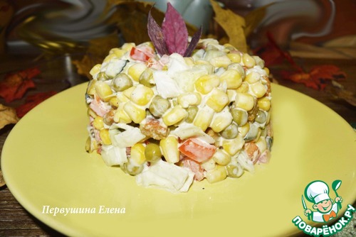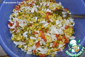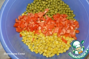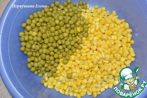 Открыть банку кукурузы и горошка. выложить в глубокую миску.