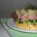 Итак, нарезаем сыр, ветчину, консервированный ананас и огурец средними кубиками. Перемешиваем, заправляем майонезом "Махеев Оливковый".