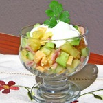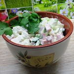 В этом салате мне нравится нарезка кубиком. Ведь мы, девочки, едим салатики не торопясь, накалывая вилочкой кусочки))) Правда?