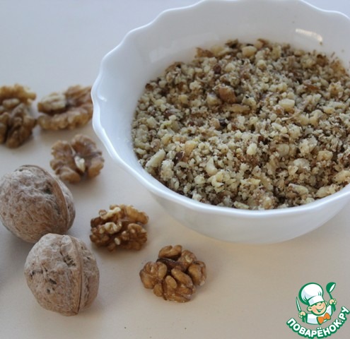 100 г грецких орехов мелко измельчить для основы с помощью скалки или блендером, остальные 100 г порубить ножом не очень мелко.