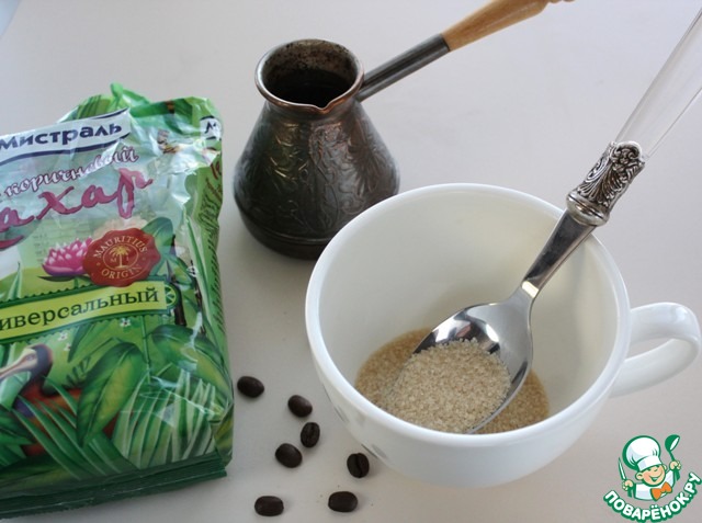 Включить духовку. Пока духовка разогревается, приготовить начинку. Первым делом сварить крепкий кофе и остудить. Отмерить 5 ст. л коричневого сахара универсальный от Мистраль.