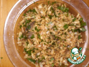 Смешать в миске крошки из сухарей, сыр, масло, соль, перец и зелень.