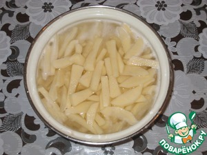 • 1. Берем курицу и режем ее соломкой, мяса не жалеем