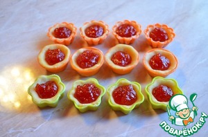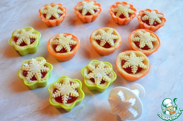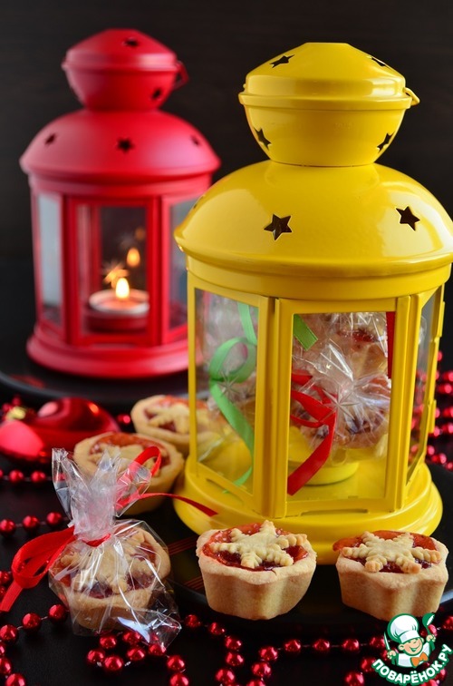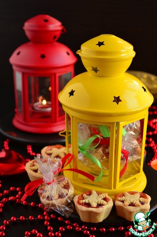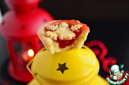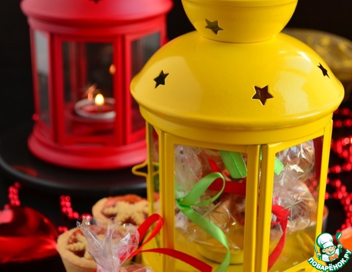 Это очень маленькие печенья-корзинки с клубничным джемом. Идея была такова, упаковать каждое печенье в прозрачную упаковку, выложить в фонарик. И подарить, прям, с фонариком! Идею такого подарка нашла на просторах интернета! По-моему идея замечательная! Только жаль, что на фото, плохо видно эти печенья, видимо из-за объемной упаковки. Это мой 200 рецепт, который посвящается моей лучшей виртуальной подруге Свете avani.