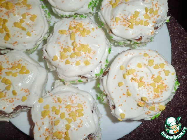 Затем сливки накладываем в кондитерский мешок и выдавливаем красивo сверху пирожных. Украшаем еще любыми шоколадными фигурками и посыпаем слегка какао.
