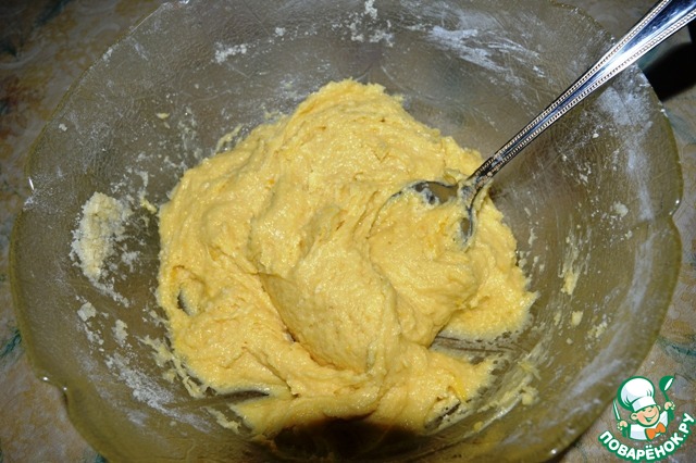 Смешать половину муки с сахаром, разрыхлителем и добавить кусочки сливочного масла.