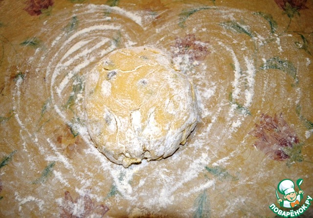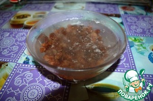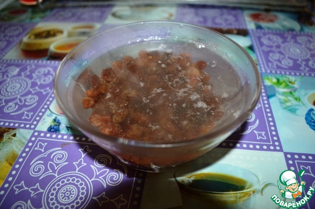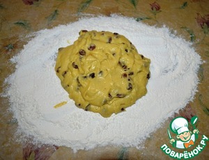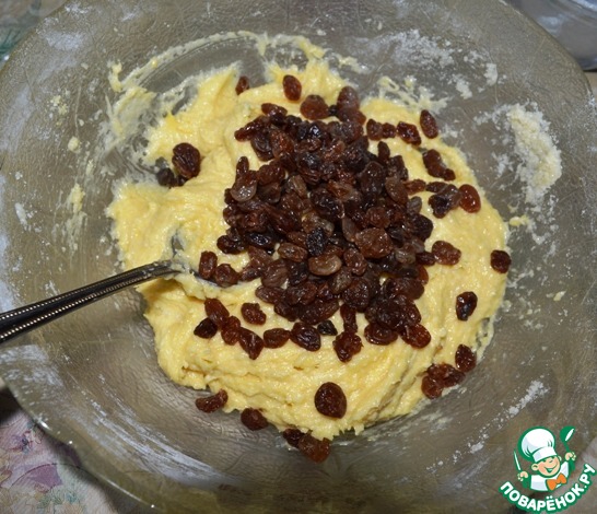Через указанное время воду слить, изюм отжать и добавить в тесто, вымешать хорошенько