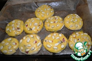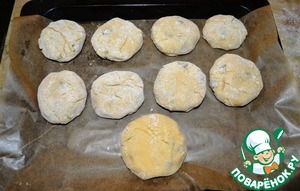 Теперь противень застилаем пергаментом (маслом не смазывать), и выкладываем на расстоянии наши заготовочки,