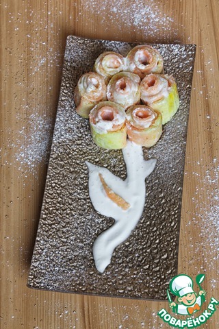 Потом разрезала его на более мелкие порционные кусочки и выложила на тарелку срезом вниз, в форме цветка. Сверху еще полила кремом. Перед подачей посыпать сахарной пудрой и немного коричневым сахаром.