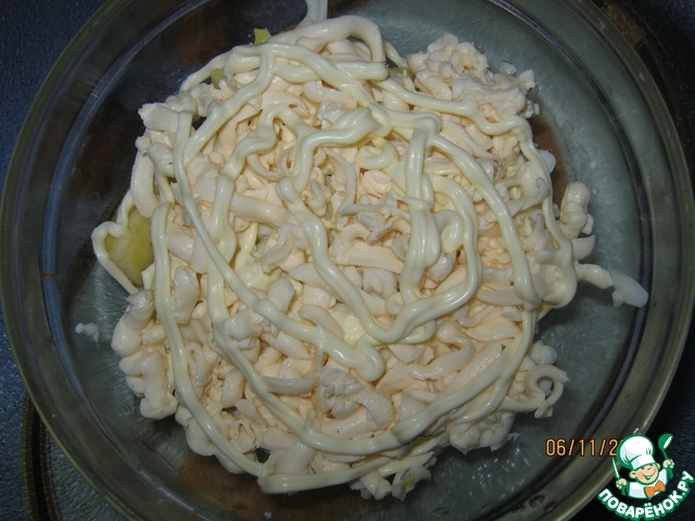 Третий слой плавленый сырок и майонез. И не притаптывайте слои, салатик получается воздушным.