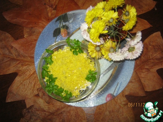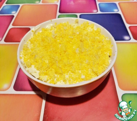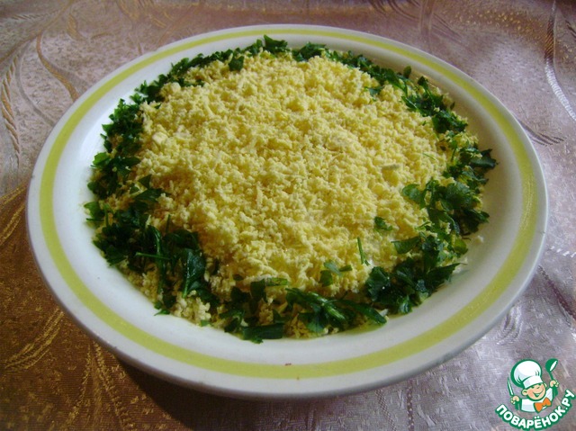 И завершаем салатик тертым на мелкой терке желтком, украшаем зеленью.