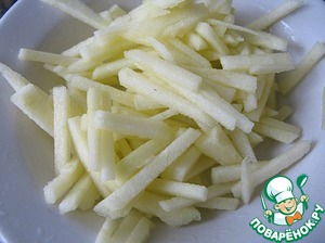 Яблоко очистить от кожуры и семечек, нарезать соломкой. Желательно сбрызнуть яблоко лимонным соком, чтобы оно не потемнело.