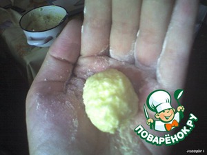 Ладони обсыпаем мукой, чтоб не липло тесто, кладем на ладошку чуть меньше чайной ложки творожной массы.