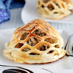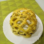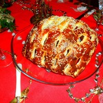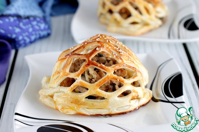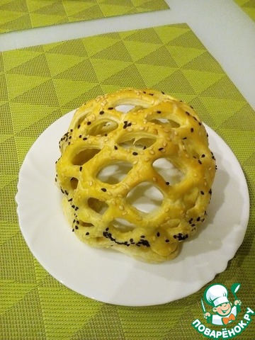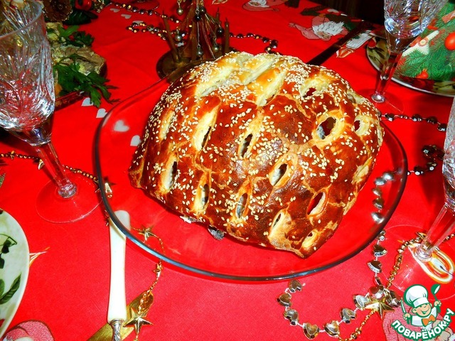 Накрыть получившейся сеткой из теста. Смазать взбитым яйцом и присыпать кунжутом, выпекать в разогретой духовке при 180С до золотистого цвета.