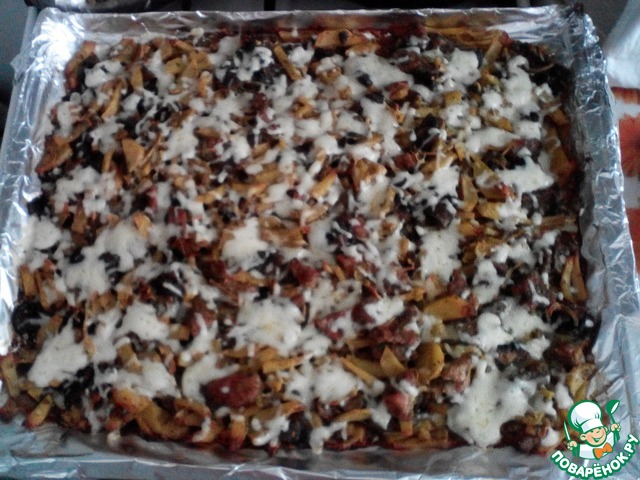 Сверху картошку равномерным слоем покрываем мясом с грибами и посыпаем тертым сыром. Сыр можно добавить и в конце, но мне больше нравится, когда он дает подсохшую корочку. А можно и вообще без сыра делать - тоже неплохо получается)))