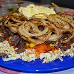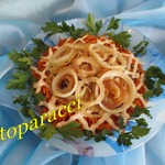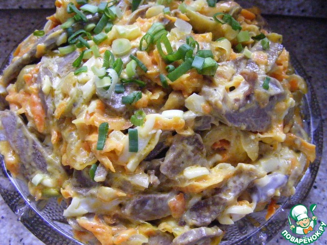 Каждый раз, когда я ем этот вкусный салат, я про себя усмехаюсь. Надо же, салат наполовину состоит из продуктов, которые я не ем в других блюдах. Печенку, конечно, готовлю для семьи, но сама «клюю» гарнирчик. Репчатый лук со времен детства стал изгоем, будь он вареным или жареным. Но в этом салате я не выковыриваю ничего и никогда! Все ингредиенты постоянно в продаже, ничего «добывать» в супермаркетах не нужно. Поэтому салат готовлю как на праздник (да простят меня анти-маЯнезники!), так и просто по охотке. Но для конкурса решила придать внешнему виду немного лоска, с претензией на ресторанную подачу)))