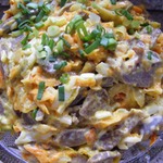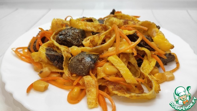 В будничном варианте немного проще: печень режется соломкой, яичный блинчик соломкой, морковь+лук обжариваются вместе, добавить кукурузы и майонез. Перемешать.