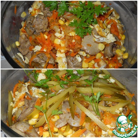 "Белорусский салат с печенью"https://www.povarenok.ru/recipes/show/15001 -только я делаю его с любыми грибами и огурцы не свежие,а маринованные. В Ваш салат добавлю вместо кукурузы именно корнишоны. За идею Спасибо! Понравилось оформление!
