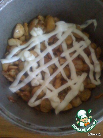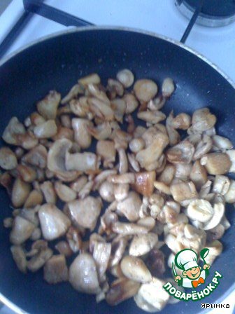 Грибочки, у меня шампиньоны, обжарить на сковородке, добавив соль и перец.