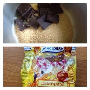 В ковшик поломать шоколад и добавить сахар. Поставить на медленный огонь