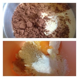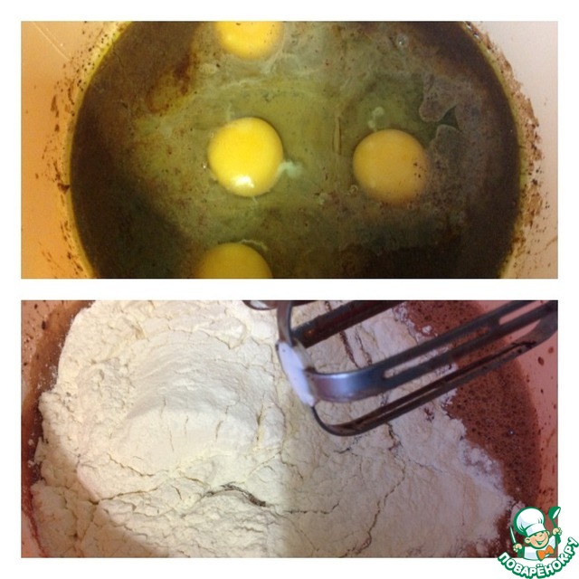 В остывшую шоколадную смесь добавить яйца и взбить. Затем добавить муку и разрыхлитель, взбить.