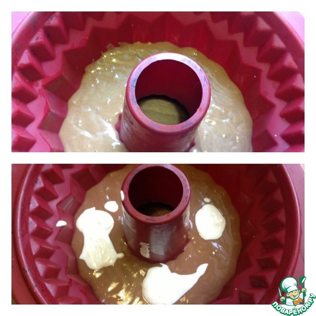 В форму вылить не много теста, и сверху ложкой произвольно выкладывать творожную начинку. слои повторить трижды, а может у вас получится и больше слоев