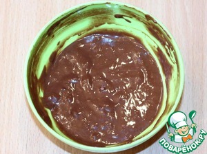 Несколько столовых ложек теста переливаете в небольшую пиалу. Я перелила 5 ст. л. теста. Смешиваете с какао. Если получится очень густая масса, разбавьте небольшим количеством молока. Это будут «жирафьи пятна».