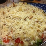 На куриный слой равномерно раскладываем помидор, нарезанный ломтиками (можно половинки черри).