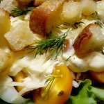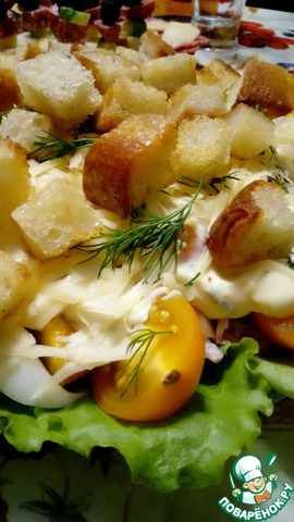 Сухариками будем посыпать салат уже при подаче на стол, чтобы они не размокли в соусе. -