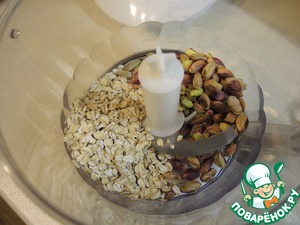 В кухонном комбайне или в блендере порубить овсяные хлопья с фисташками в мелкую крошку.