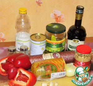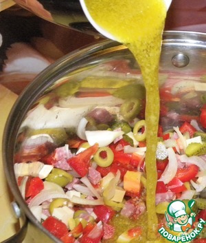 Чеснок пропускаем через пресс, перемешиваем с маслом, уксусом, горчицей, солью и перцем. И заливаем этой "адской" смесью наш салат.
