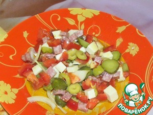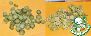 Кружочками режем огурчики и оливки. Лук - полукольцами.