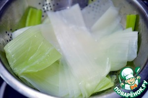 Лук помойте, разрежьте толстые стебли пополам, чтобы получились полоски
