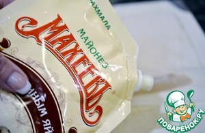 Смазать майонезом. Я взяла майонез класса Premium ТМ Махеевъ с перепелиным яйцом, т. к. он не содержит крахмала и изготовлен по ГОСТ.
