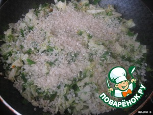 А вот теперь, самое интересное: добавляем в капусту с зеленью наш рис и доливаем водичку (на 1 см выше).