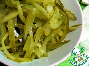 • Нарежьте соленые огурцы (я порезала соломкой - можно и "колесиками")