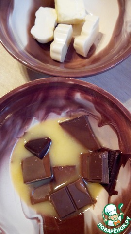 Сливочное масло делим пополам и растапливаем на водяной бане половину с темным шоколадом, вторую половину с белым. Для ускорения процесса можно воспользоваться микроволновкой.