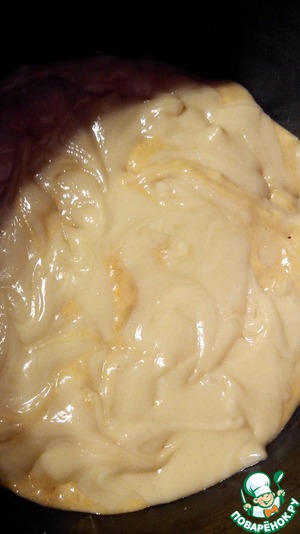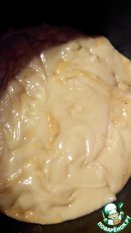 Первую часть смешиваем со смесью из темного шоколада и масла. Выкладываем тесто в форму, разравниваем...